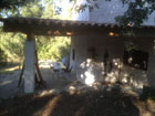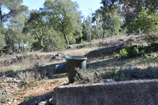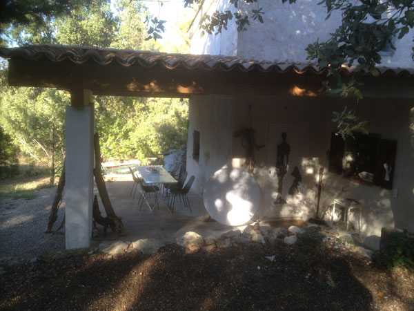 auf der Ostseite des Hauses, runder weisser Blechtisch eventuell schon bereit, sonst im "Cabanon" unterhalb des Hauses gelagert.