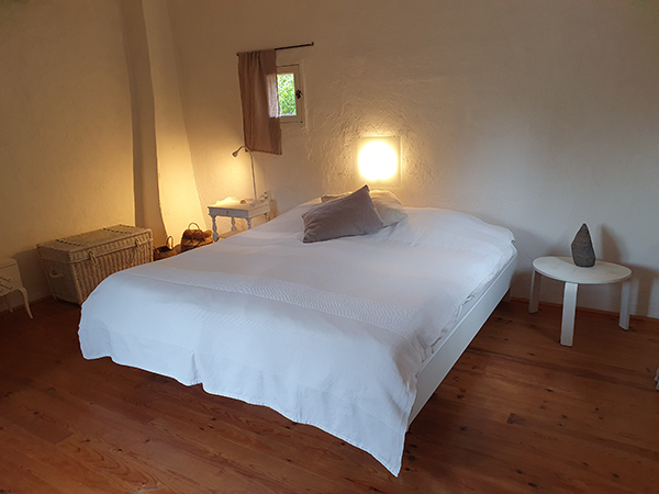 vom Wohnzimmer aus "Hühnertreppe" ins grosse Schlafzimnmer im 1. Stock mit grossem Bett (Einzelmatratzen), Tisch.