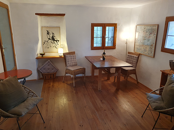 Wohnzimmer mit grossem Esstisch, grosser heizbarer Schmiedeisen-Ofen.