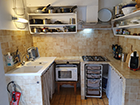 Die gut mit Kochutensilien, Geschirr, Gläsern und Besteck ausgestattete Küche mit Gasherd und Gasflasche, kleinem Elektrobackofen und Kühlschrank.